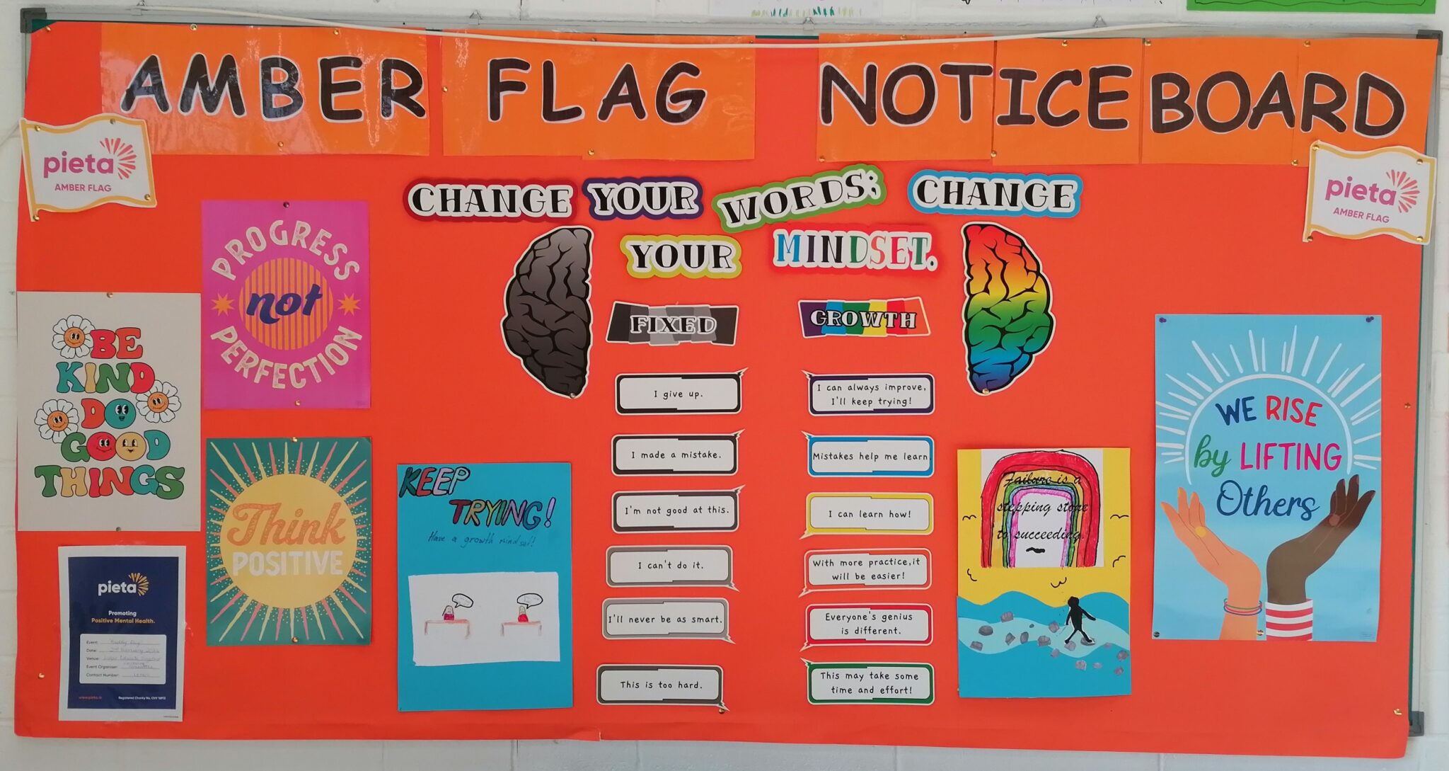 - We created and aim to develop Our Amber Flag noticeboard in the school. This promotes positive mental health strategies. Our Student Council created posters on the Amber Flag noticeboard in the school hall. The amber flag notice board helps us to raise awareness in our school community and reminds us of the things that we can do to look after our wellbeing.
