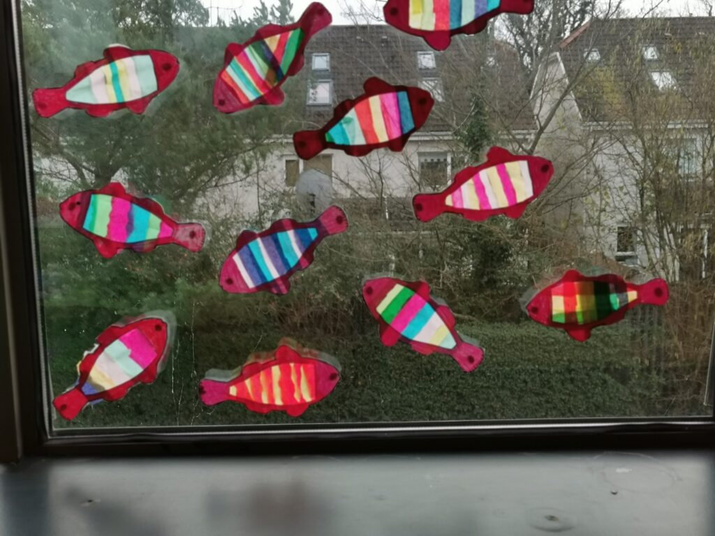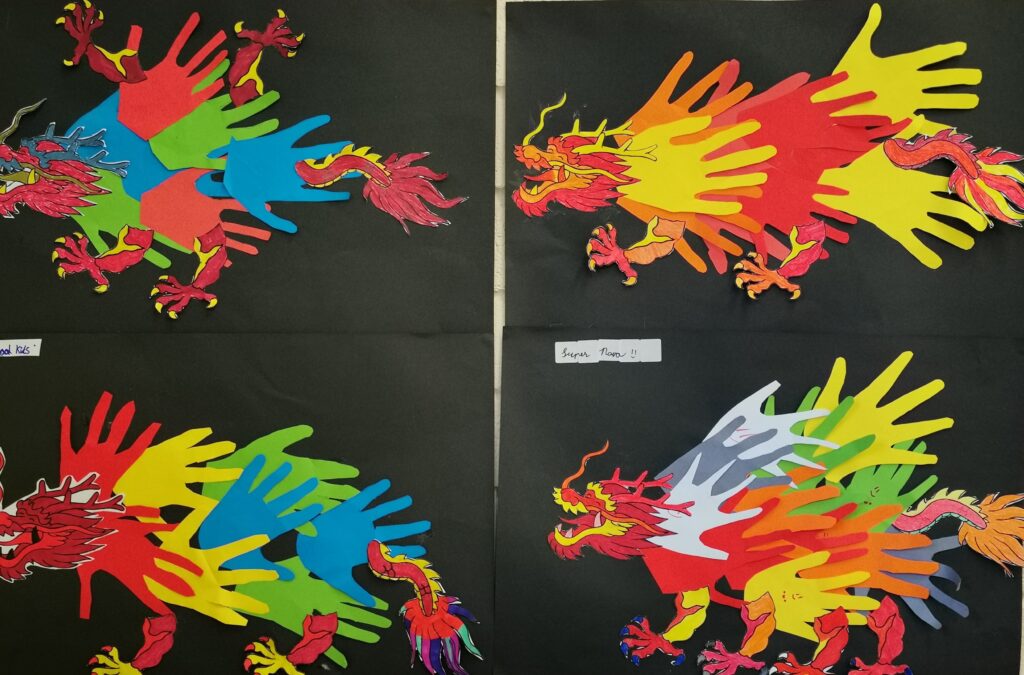 Jenny’s Fourth Class did beautiful stained glass lucky fish and collaborative handprint Dragons