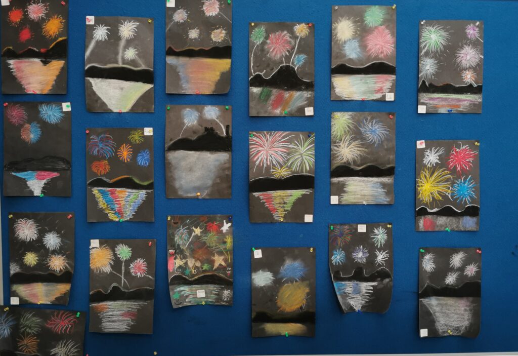 They are reading the Firework Maker’s daughter and did some pastel festival fireworks
