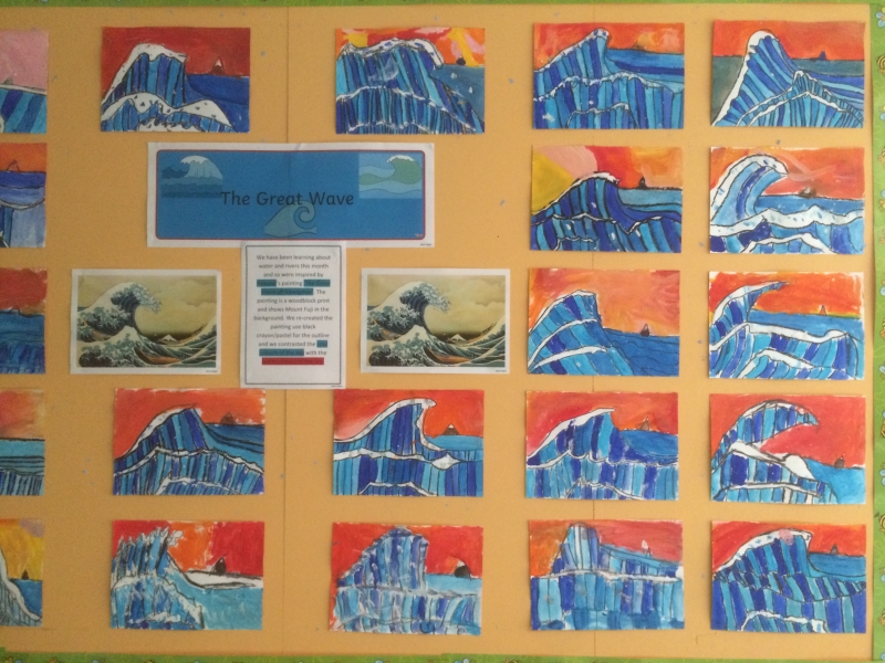 Karen’s 2nd class were inspired by Hokusai’s ‘The Great Wave off Kanagawa’. We re-created this piece of art work and explored warm colours and cool colours and perspective. We really enjoyed creating these, take a look at them below.