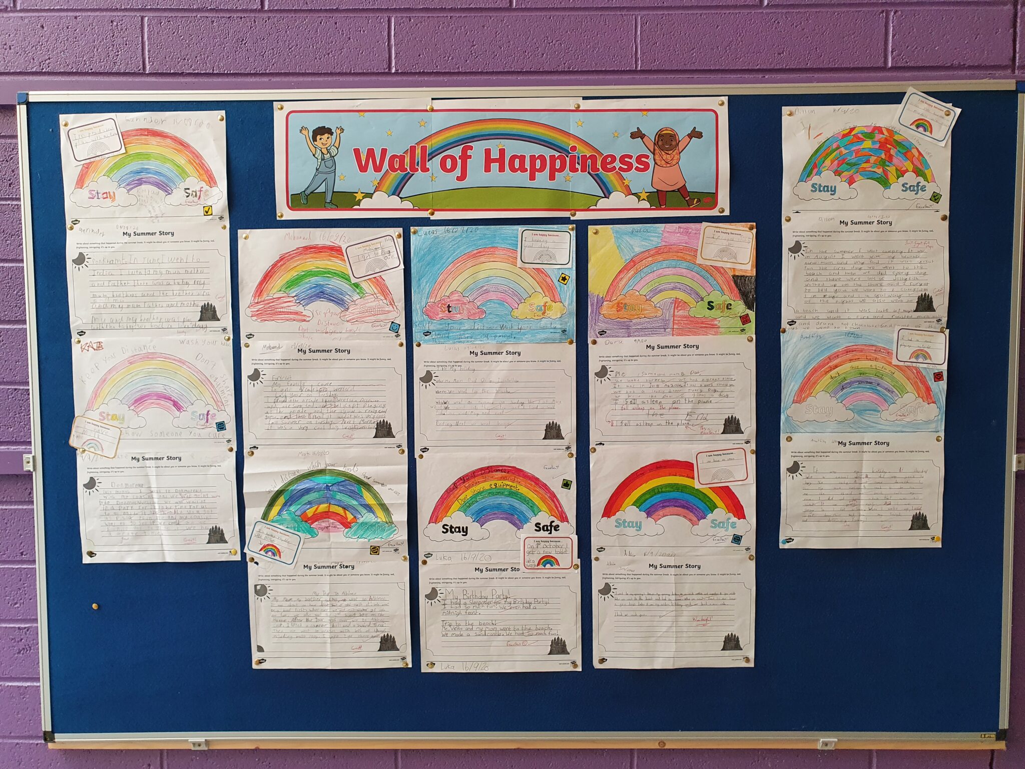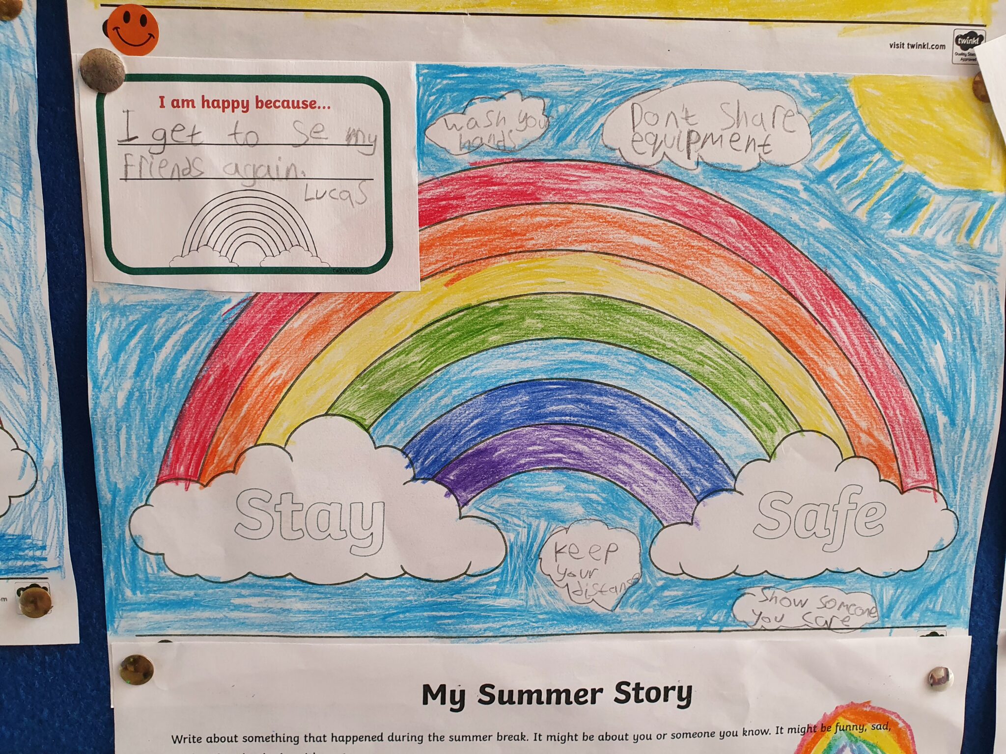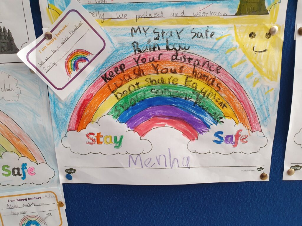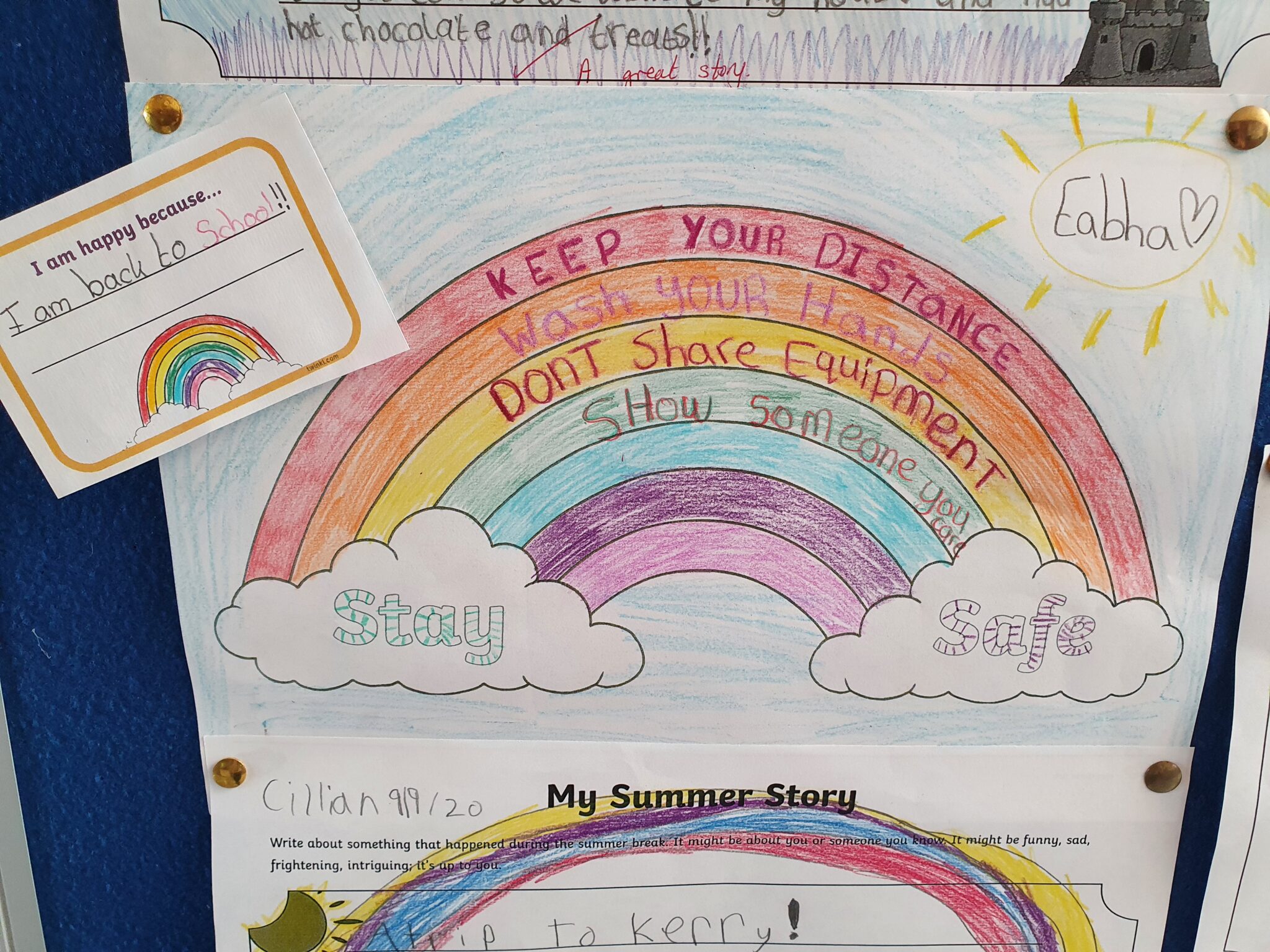 Third class wrote beautiful stories about their Summer and shared it with their friends. They also discussed why they’re happy to be back in school and all the things we need to do to keep safe in school.
